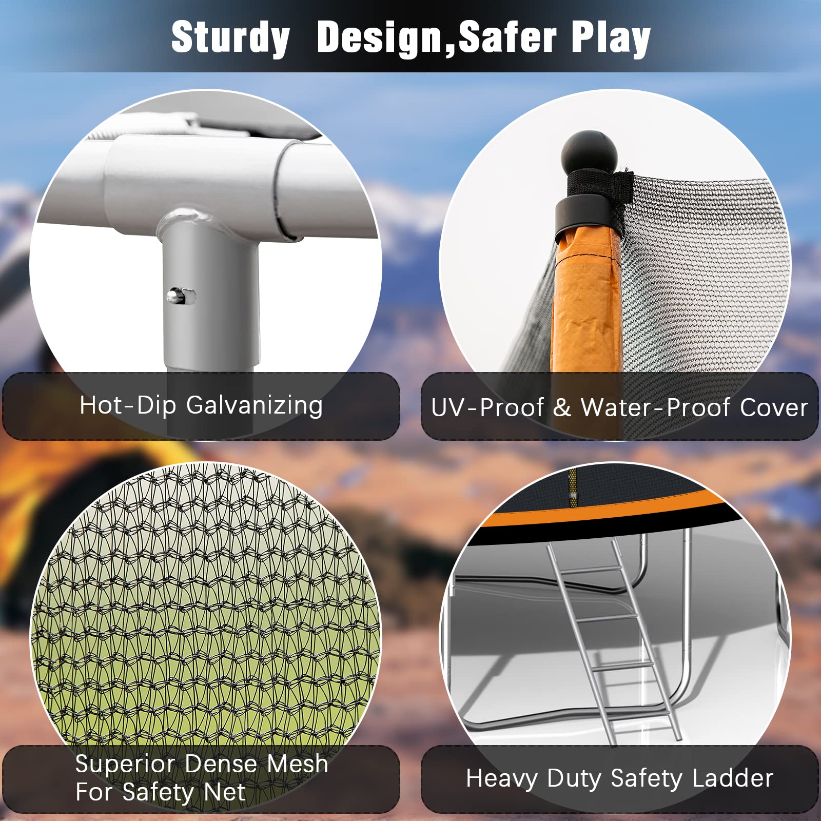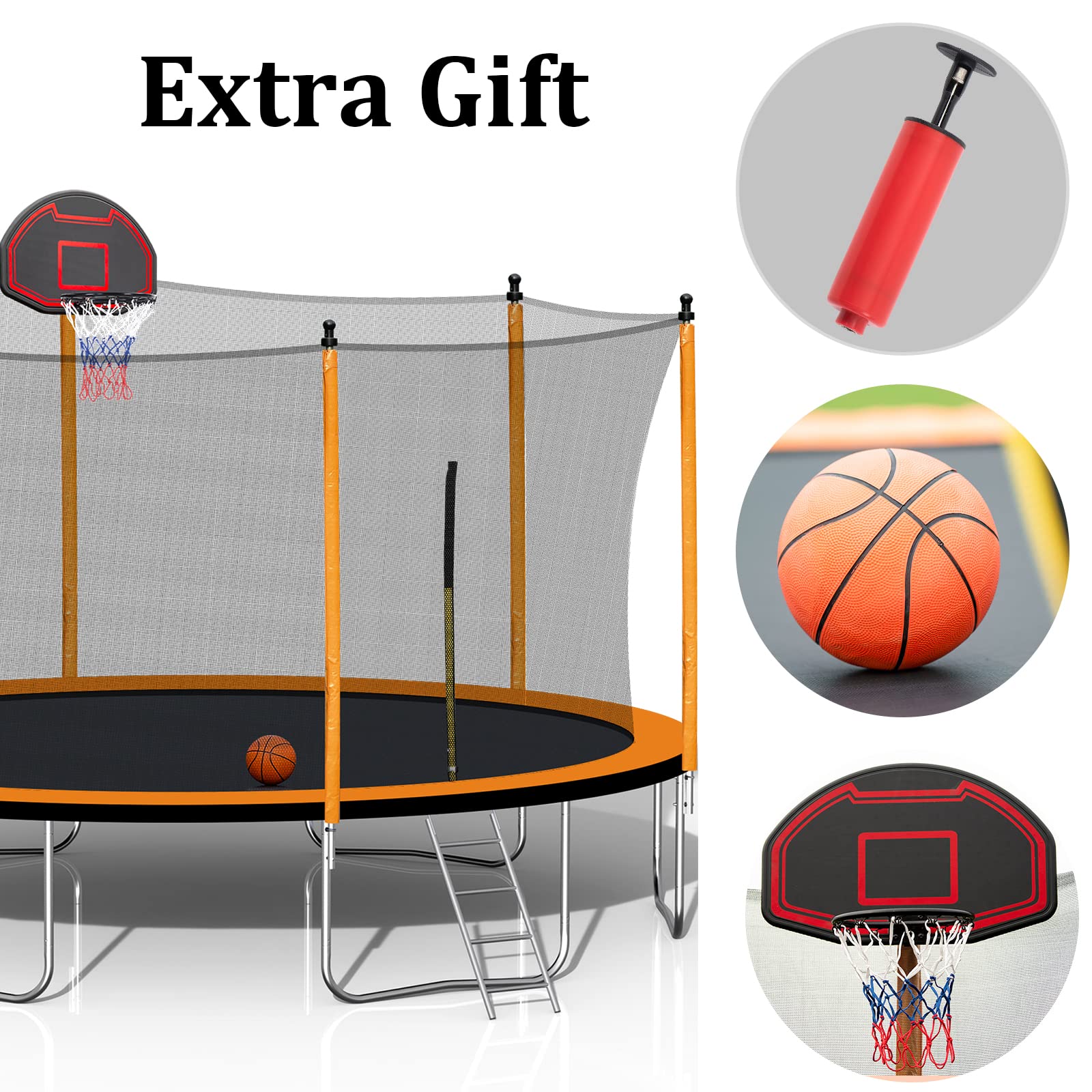 - 【COMPLETE TRAMPOLINE ACCESSORIES GIFT】Our trampolines are equipped with basketball hoop, net, rubber ball, inflator and ladder. We have detailed assembly instructions that will help you assemble the round trampoline easily and effectively. All of our trampolines are thoroughly tested for their safety and durability.